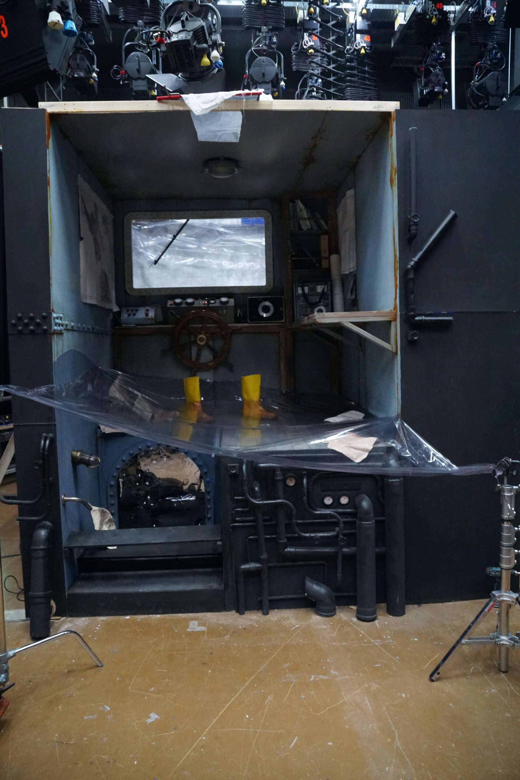 Das Wasser steigt in der Steuerkabine, dem Kapitän steht das Wasser bis zur Mitte der Waden, er weiß, dass er verloren ist, und schaut mit resigniertem Blick auf den Betrachter (Er sollte ursprünglich viel aktiver sein und panisch im Radio anrufen, während er seinen Kumpanen beim Untergehen beobachtete). Die Wasseroberfläche wird durch eine durchsichtige Plastikplane konkretisiert, die dick genug ist, um den Zügen und Verdrehungen beim Dreh standzuhalten. Die Oberflächen des Sets unterhalb dieser Grenze sind in einer dunkleren Farbe gestrichen, um diesen Schwelleneffekt zu verstärken. Die Falten, die durch die Spannungen der Beine und die Objekte in der Szene verursacht werden, führen zu wellenartigen Effekten.