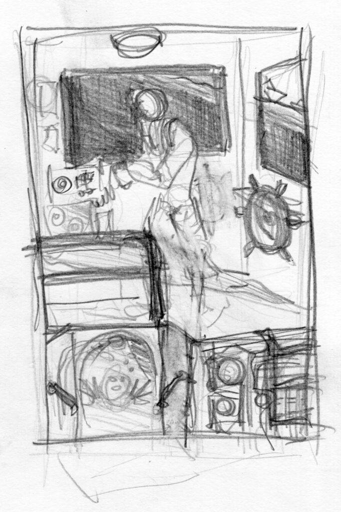 Vorbereitungsskizzen und Brainstorming, sowohl zum Inhalt als auch zur Form, riesige Badeente, absurde Situation eines untergehenden Wohnzimmers, verschiedene Kompositionen, Format, usw. … In meinen ersten Ideen wollte ich die Redensart illustrieren, dass das Anzünden einer Zigarette mit einer Kerze ohne Streichhölzer Unglück bringt oder sogar einen Seemann tötet. Der Kapitän sollte sich also eine Zigarette mit einer Kerze oder einer Öllampe anzünden. Ein Matrose, den man durch das Fenster ertrinken sieht, bringt ihm Streichhölzer (was unter Wasser natürlich absurd ist). Dutch angle, um den Schiffbruch zu simulieren und Bewegung zu geben wurde von anfang an klar.